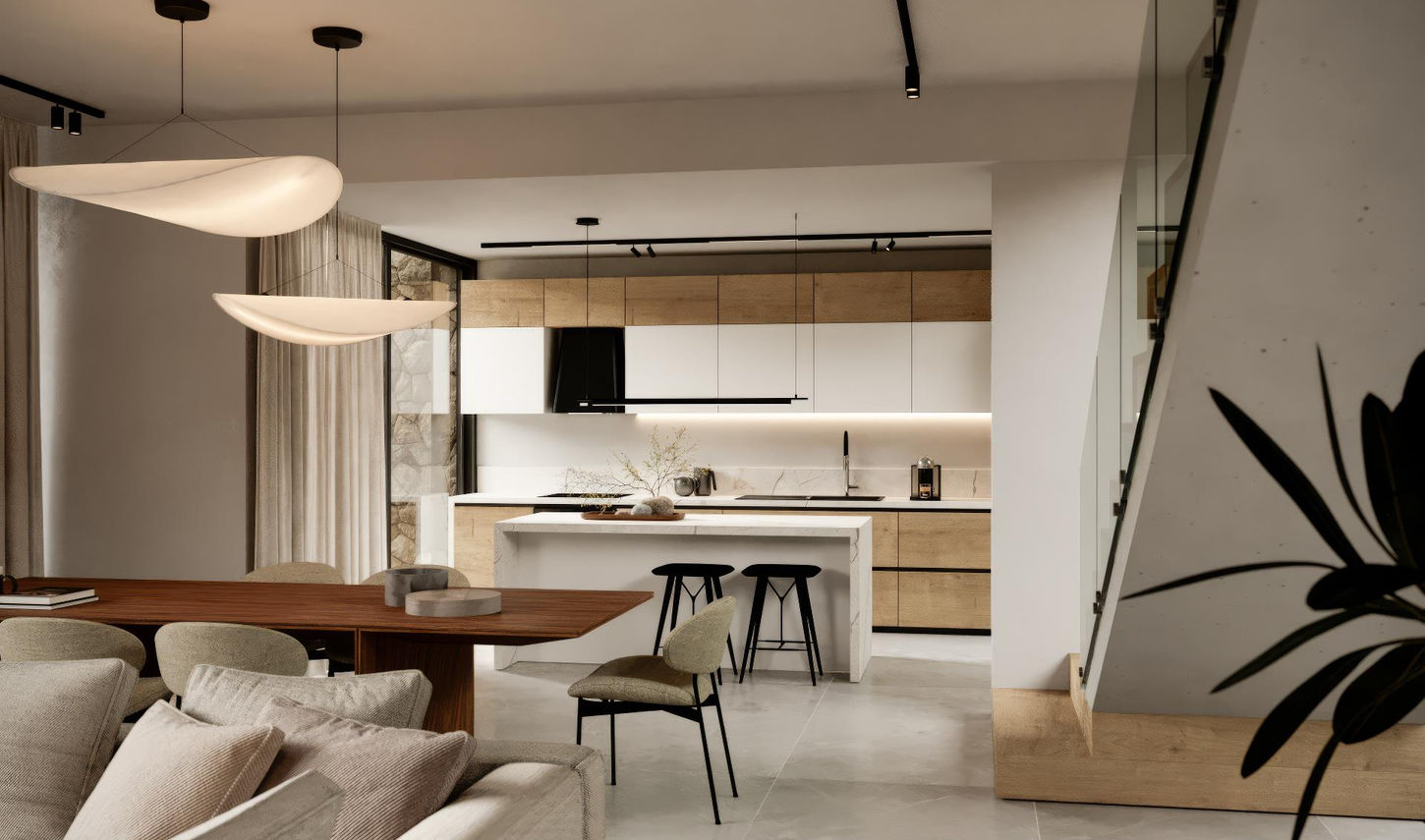 Featuring four spacious bedrooms, three bathrooms and an additional guest toilet. Distinguished by the use of high- quality materials, it's a testament to sophistication. Fairface concrete, stone walls, and wood cladding are employed to create a captivating aesthetic, ensuring a unique character.
